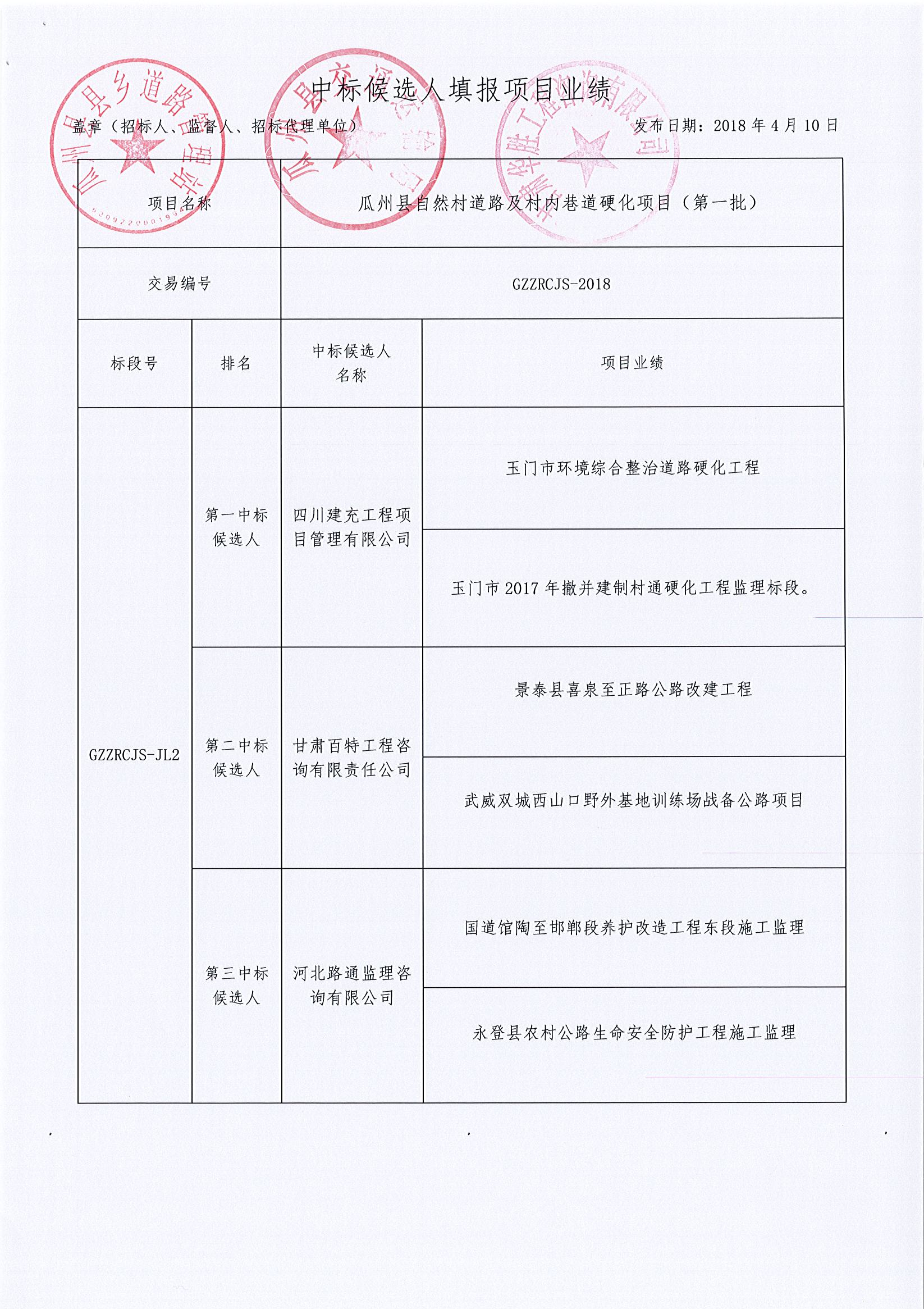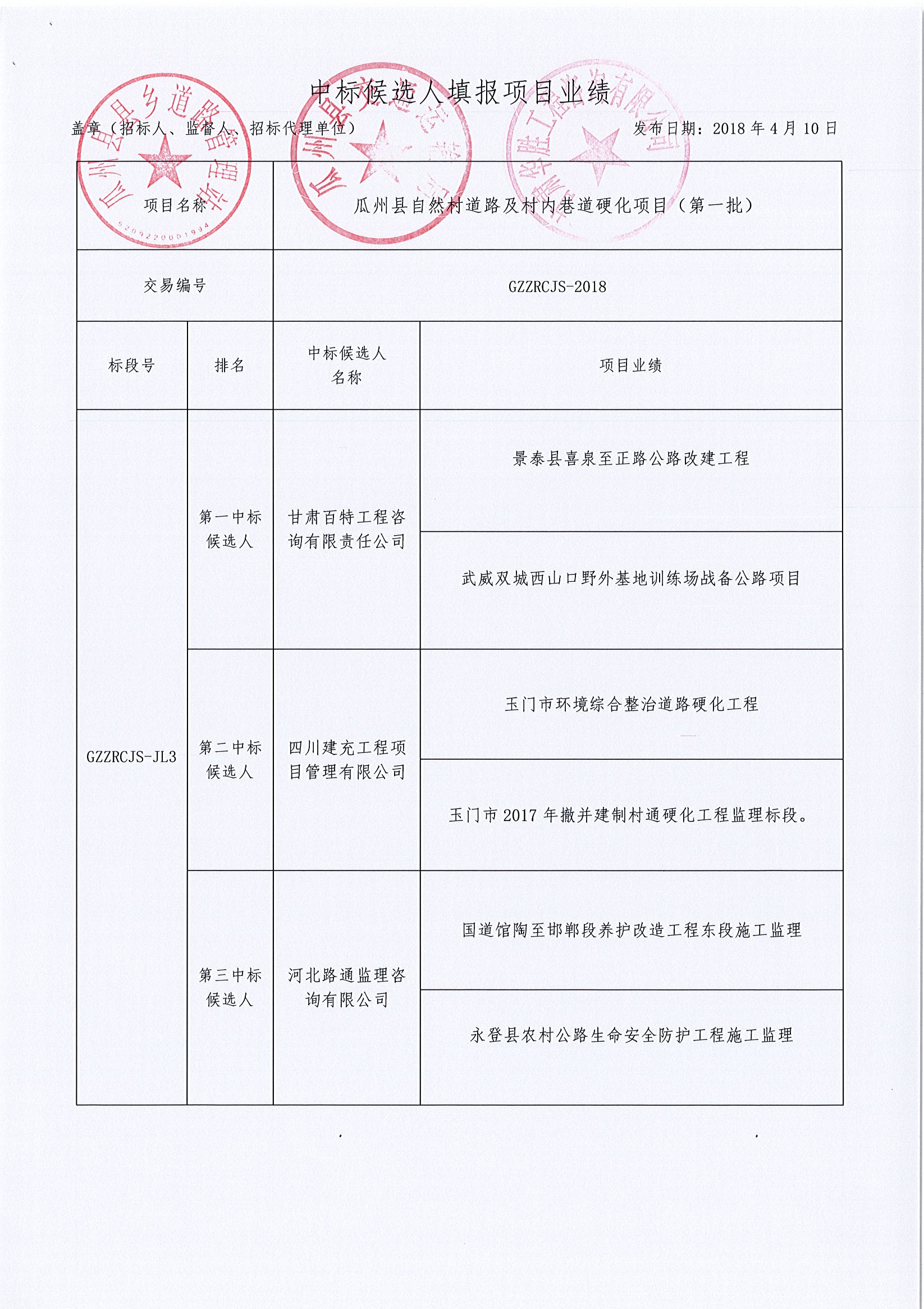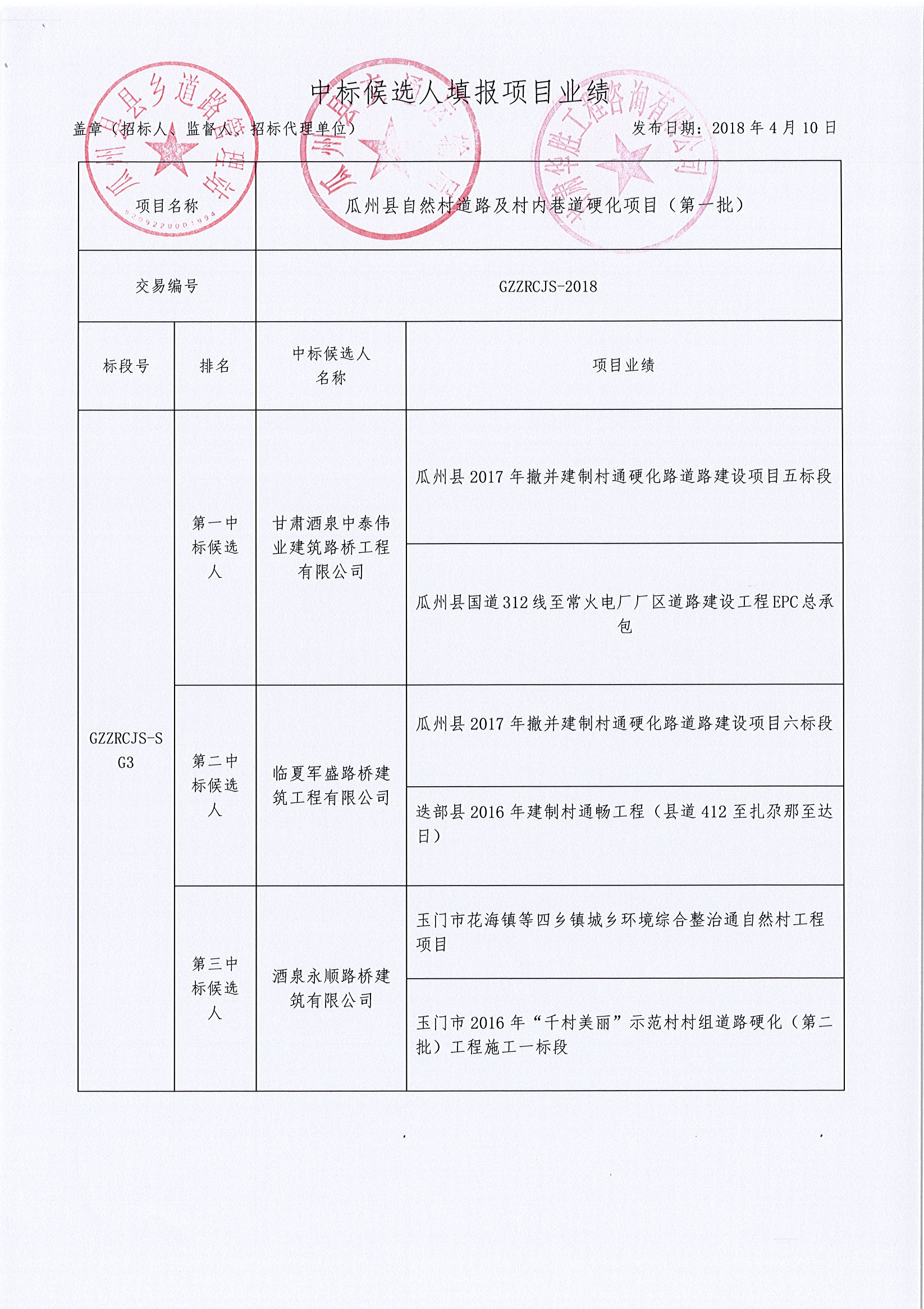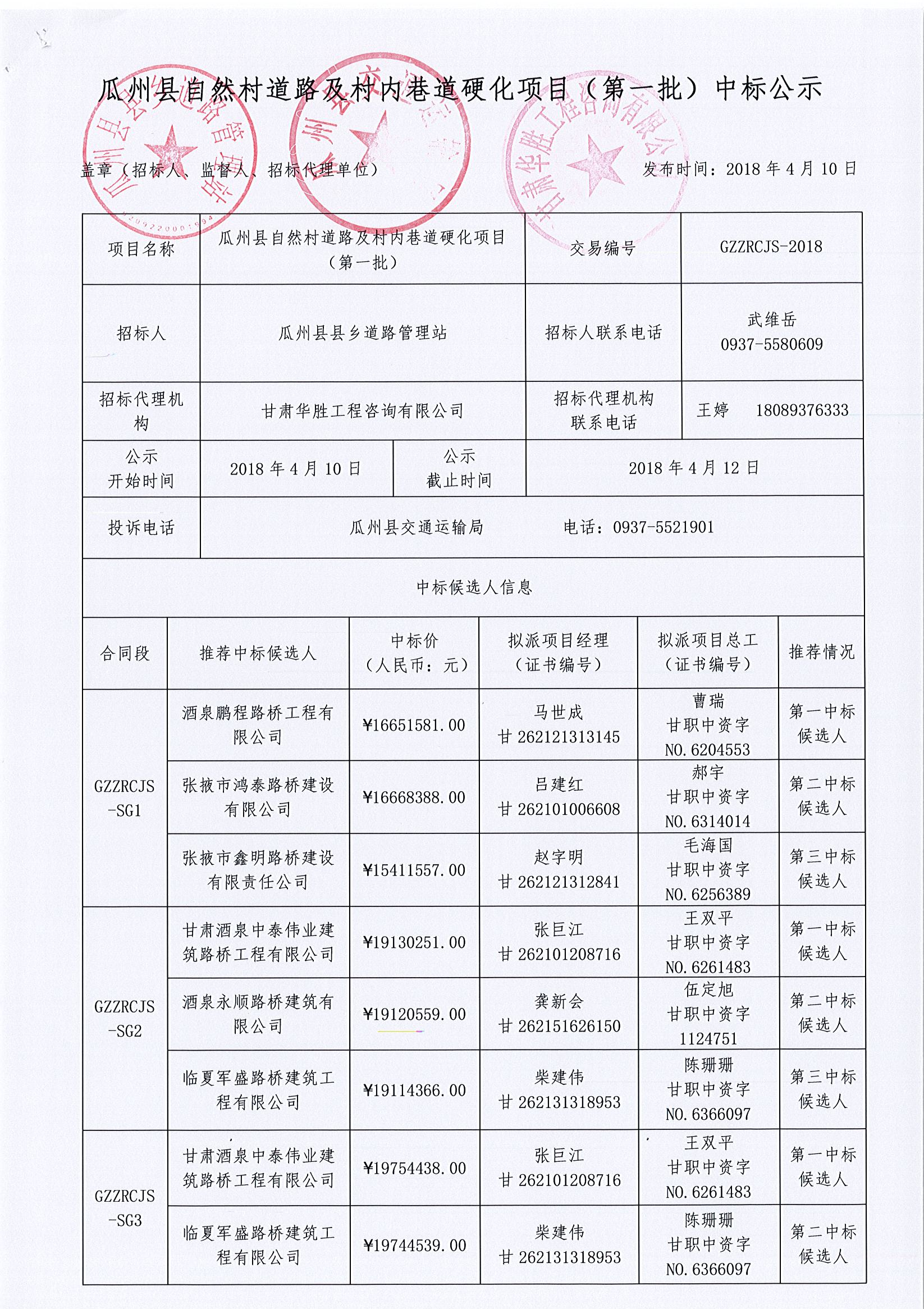 瓜州县自然村道路及村内巷道硬化项目(第一批)中标公示